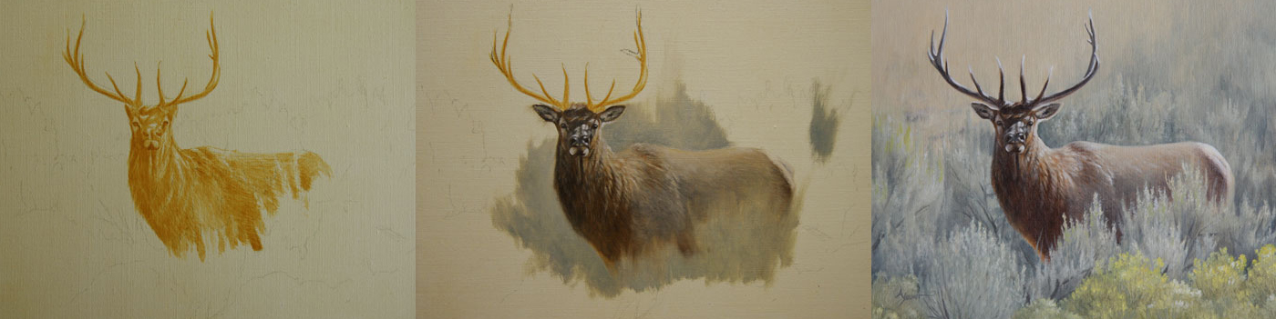 With all of the information about the birds plumage established, I work the entire scene, trying to avoid creating any confusing areas. To do this I wash some areas into shadow, while adding highlights in other areas.